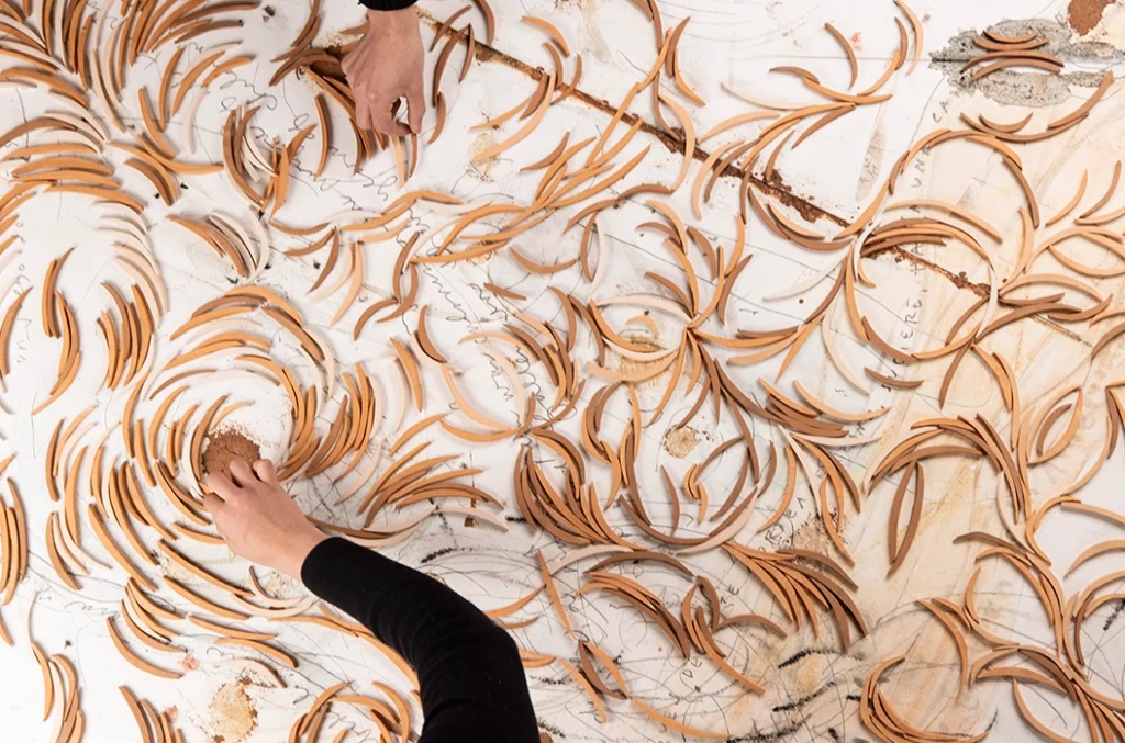 A partir de ese cruce nació este proyecto. Para The Space in Between realicé tres grandes impresiones a partir de collages de mis cuadernos, incluyendo páginas y notas del viaje. Sobre estos paneles, un grupo de doce participantes fue invitado a intervenir colectivamente disponiendo cerca de 3.000 pequeñas piezas de cerámica en forma de medialuna, manipuladas con la punta de los dedos. La consigna fue simple: seguir la intuición, observar ritmos, responder a las decisiones de otros y permitir que la imagen emergiera a través del juego.