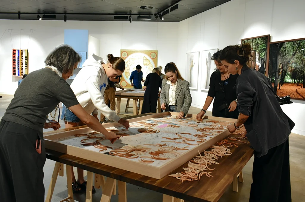 La cartografía resultante no representa un territorio fijo, sino un espacio vibrante. Es un registro frágil y situado de un instante de vida compartida: un tapiz tejido entre muchas manos que da cuenta de la potencia de lo colectivo y del valor del presente. En ese “entre” —entre personas, ideas, memorias y materiales— la obra deja abierta una pregunta que resuena más allá del espacio expositivo: ¿y si pensar, hoy, fuera ante todo un acto colectivo de cuidado?